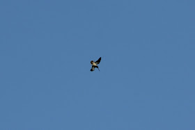La nómina de aves fue bastante grande con algunas sorpresas a destacar. Por ejemplo pude ver mis primeros Vencejos Pálidos volando en un grupo de Vencejos Comunes (lo que facilitó su identificación). También pude ver al gorrión al que que más ganas le tenía en Ávila, el Gorrión Moruno. Varios machos de este preciosos pajarillo se dejaron ver a placer. Lo mismo pasó con un Abejero Europeo que nos pasó por encima, viendo claramente sus características como esa cabeza tan característica.