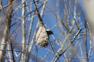 En uno de mis paseos he podido ver uno de estos globos blancos del que asomaba su precioso inquilino. El Pájaro Moscón (Remiz pendulinus) es un pequeño pajarillo de tonos pardo rojizos  en el dorso, la cabeza de color grisáceo y un bonito antifaz negro (más grande en el macho). Tiene un canto muy característico y eso me ayudó a detectarlo entre la maraña de ramas donde elige poner este peculiar nido. Esperemos que saque adelante una nueva generación de estos preciosos pajarillos.