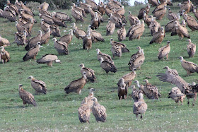 Así se encontraban  estos gigantes de los cielos. En una de mis últimas salidas (tengo un par de ellas en el horno) tras recorrer varios puntos de la provincia sin mucho que reseñar me encontré con este banquete a punto de empezar. Decenas de Buitres Leonados (Gyps fulvus) esperaban a que uno de ellos diese el pistoletazo de salida para empezar a devorar el cadáver de una vaca malograda. Mientras dudaban de empezar otros muchos se acercaban por el aire entre los que se encontraban varios Buitres Negros (Aegyptus monachus).