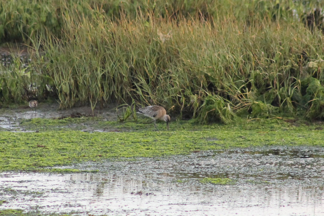 Ahora el Correlimos Zarapitín (Calidris ferruginea) de mayor tamaño, pico muy largo y curvado, ceja marcada y vientre blanco.